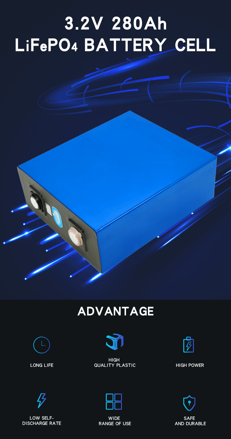 இந்த UL சான்றளிக்கப்பட்ட 3.2V 280Ah LiFePO4 பேட்டரி செல் பின்வரும் நன்மைகளைக் கொண்டுள்ளது: