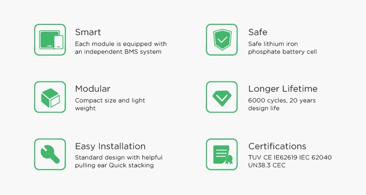 சான்றிதழ் மற்றும் பாதுகாப்பு நிலை | TUV / CE / EN62619 / IEC62040 / UN38.3 / CEC அங்கீகாரம் பெற்றது | |