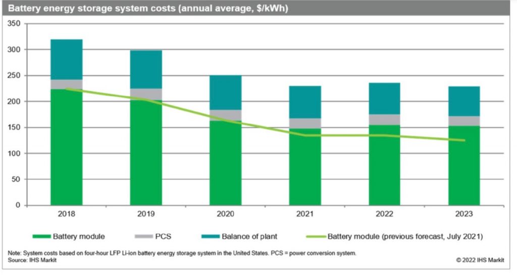 சமீபத்திய வெள்ளைத் தாளில், IHS Markit கச்சாப் பொருட்களின் விலை அதிகரிப்பு மேலும் EV பேட்டரி விலை சரிவை 2024 வரை நிறுத்தி வைக்கும் என்று கணித்துள்ளது. அந்த பகுப்பாய்வு சராசரியாக 2022 EV பேட்டரி விலை 2021 ஐ விட 5% அதிகமாக இருக்கும் என்று கணித்துள்ளது, பெரும்பாலும் அதிகரித்த ஆட்டோ- லித்தியம் இரும்பு பாஸ்பேட் (LFP) பேட்டரிகளுக்கான தொழில்துறை தேவை.